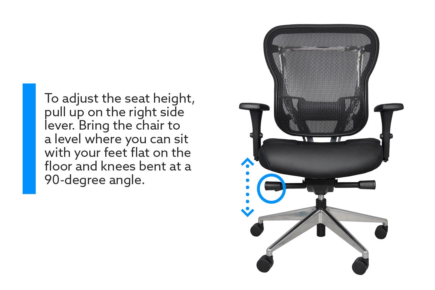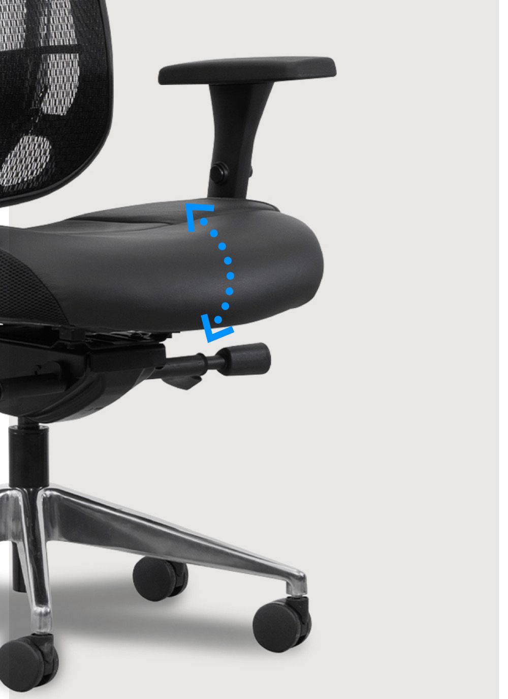 The chair parts used are also very solid and can hold up to 300 lbs. This chair is made with a solid base and black frame. The leather seat has a waterfall edge for ultimate comfort for the back of your knees. The mesh backrest is built with a strong, breathable mesh that has good flexibility to it to form to your body. The arm rests are a little towards the firm side, but offer a wide variety of adjustments. This chair was built to last.