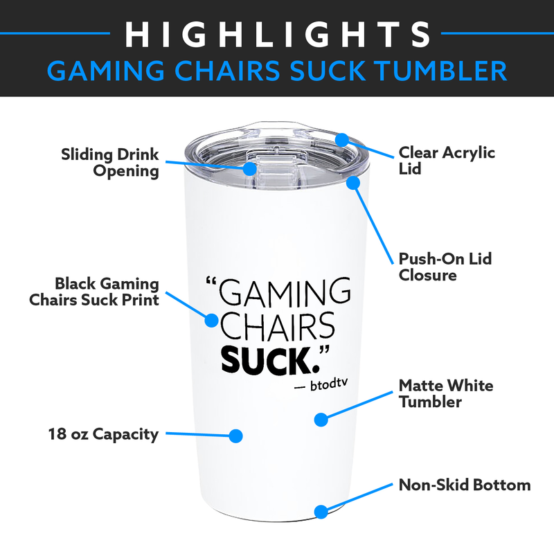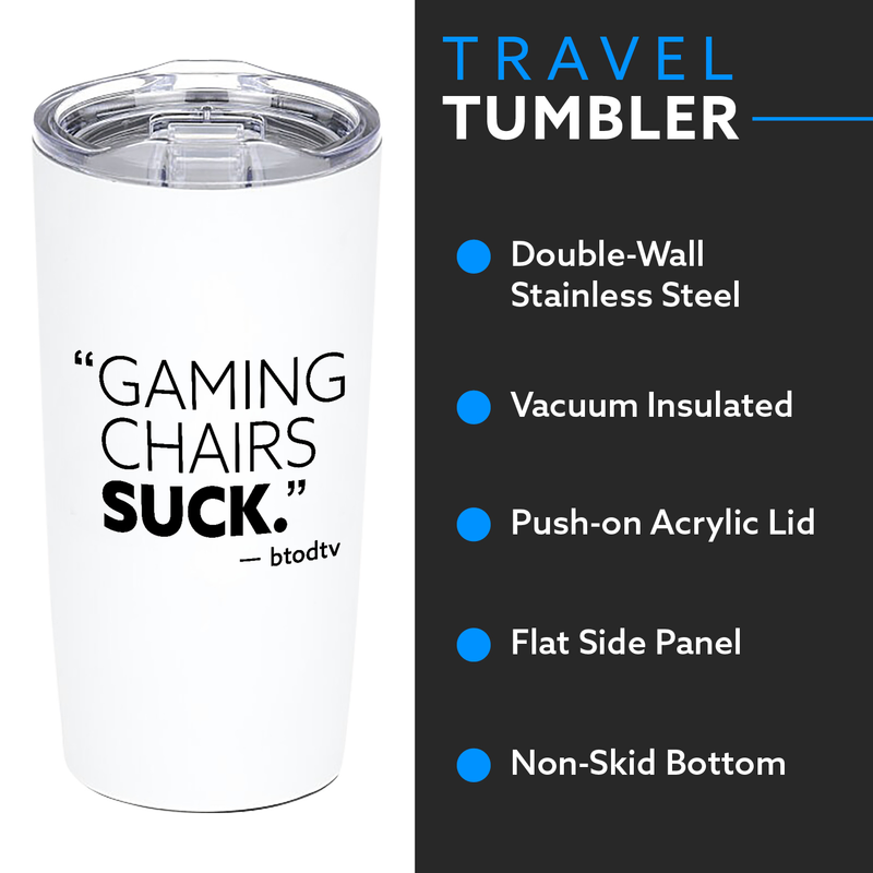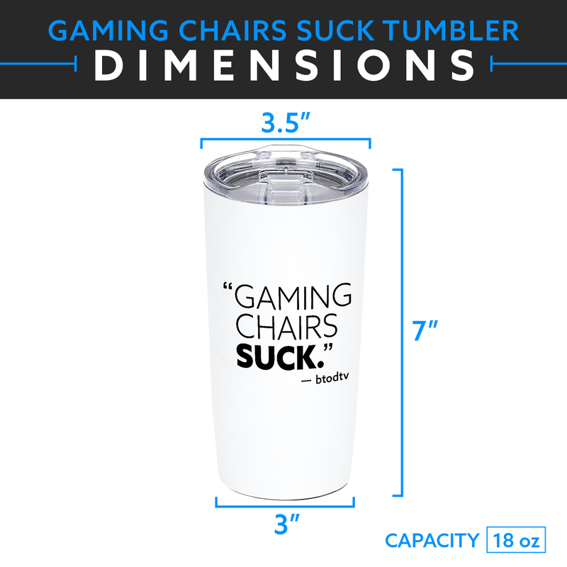 The best part of waking up... Is a chair that doesn't suck! Support the BTODtv channel wherever you go with our Gaming Chairs Suck Tumbler. Available in matte white powder coat finish, slide to close lid, and non-skid bottom.