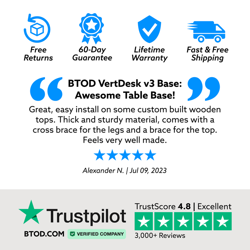 VertDesk v3 Base: A robust foundation for your custom desktop. Enjoy best-in-class stability with thick steel columns, premium German Ketterer motors & Laing Innotech electronics. DIY-friendly, USA-built, with a lifetime warranty & 60-day returns.