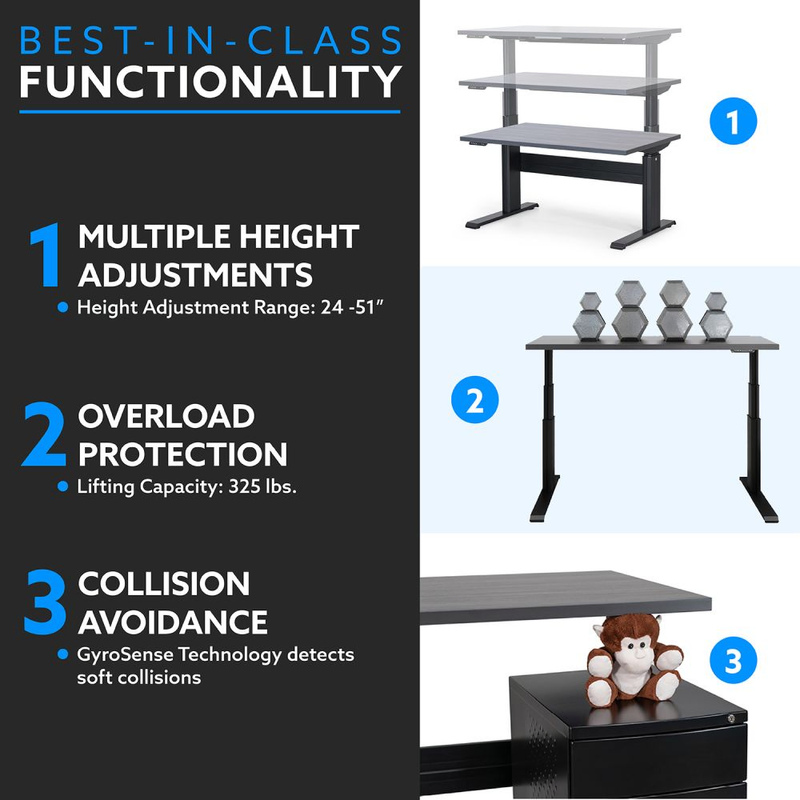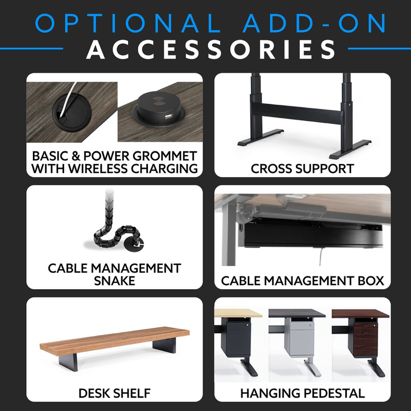 Also made of extruded aluminum, the XT’s cross support ensures this standing desk is the most stable on the market. By adding the cross support option your desk will have absolutely zero movement, even at heights of 51 inches! This ultimate steadiness is due to a frame underneath the top, connecting both legs, and the cross support spanning across the bottom half of the frame.™ |