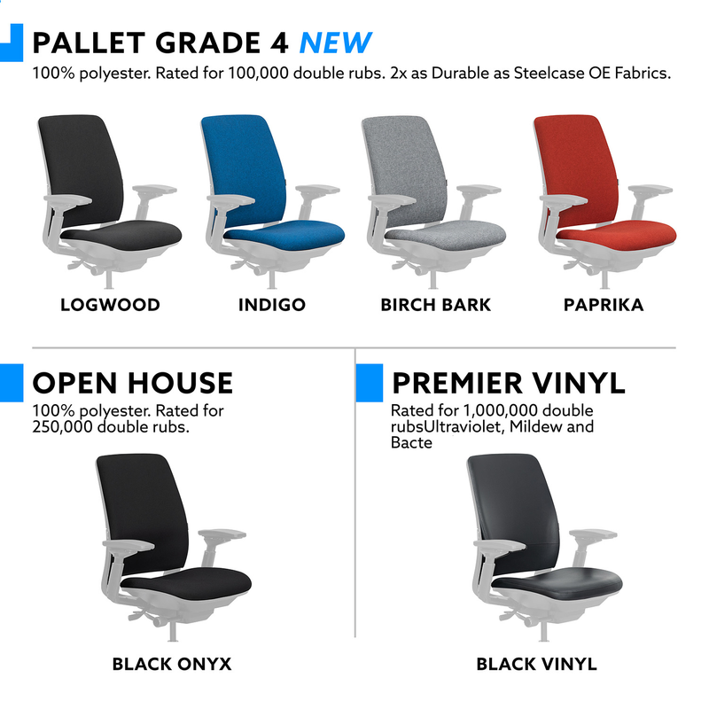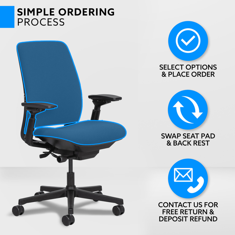 Premium refurbished seat and back pads for Steelcase Amia. Verify compatibility using product images before ordering. Choose OEM feel or extra cushion. Easy 30-minute install. 6 fabrics, 2 thicknesses. 2-year warranty. Returns not accepted.