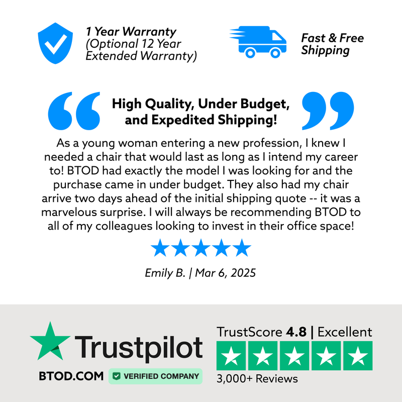 This warranty covers defects in material and workmanship for a period of one or twelve years from purchase and is non-transferable. This includes the entire chair. BTOD.com will repair or replace, at its option, any defective part or component. This warranty is void if the product is found to have been misused or modified. This includes a max capacity of 400 lbs.