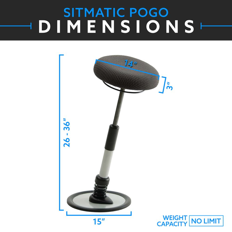 The Pogo® is Made in America and it is composed of high quality components. The base, spring and column are made from steelthatmakes them feel thick and strong. The base plate is surrounded by a styrene-butadiene rubber (SBR), whichis most commonly found in tires. It was chosen by Sitmatic because of its longevity but also because it performs well on both carpet and hard surfaces. The Pogo® has pneumatic seat height adjustment. Sitmatic usesPressureCast™ foam cushions. This is a molded foam product, which is superior to cut foam. The process in which molded foam is produced makes a much more consistent product because each individual piece is molded to the exact specifications instead of cut foam coming off a larger piece. Frame and Spring come in either black or silver.